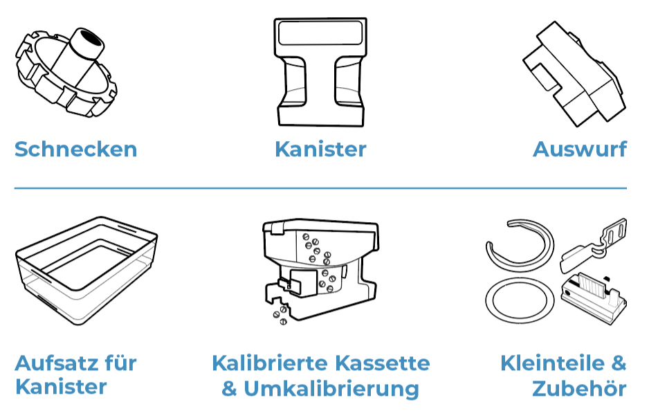 Die Kassetten werden inklusive Schnecke, Auswurf, Chip, Trenner & Beschriftung fertig kalibriert geliefert.