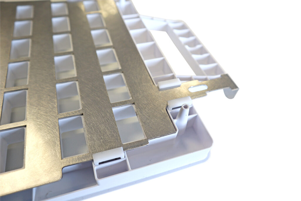 Die größte Besonderheit des PrimeBlister STS Tray ist die werkzeuglose Demontage: Dank Clips auf der Unterseite lässt sich das Tray schnell zerlegen und bequem in der Spülmaschine reinigen.
